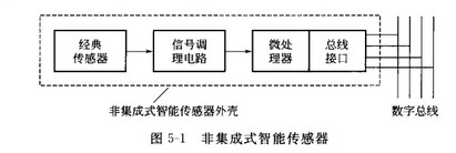 笫一,非集成化实现。非集成化智能传感器是将传统的经典传感器(采用非集成化工艺 制作的传感器,仅具有获取信号的的功能)、信号调理电路、带数字总线接口的微处理器组合 为一个整体而构成的智能传感器系统。其框图如图5 1所示。