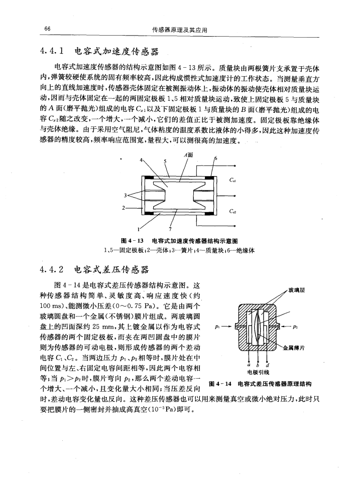 | 以下是引用片段: 电容式加速传感器的结构示意图如图4 - 13所示,质量块由两根簧片支 承置于壳体 内,弹簧较硬使系统的固有频率较高,因此构成惯性式加 速度计的工作状态。当测量垂直方向上的直线加速度时,传感器壳体固 定在被测振动体上,振动体的振动使壳体相对质量块运动,因而与壳体 固定在一起的两固定极板1、5相对质世块运动…… |