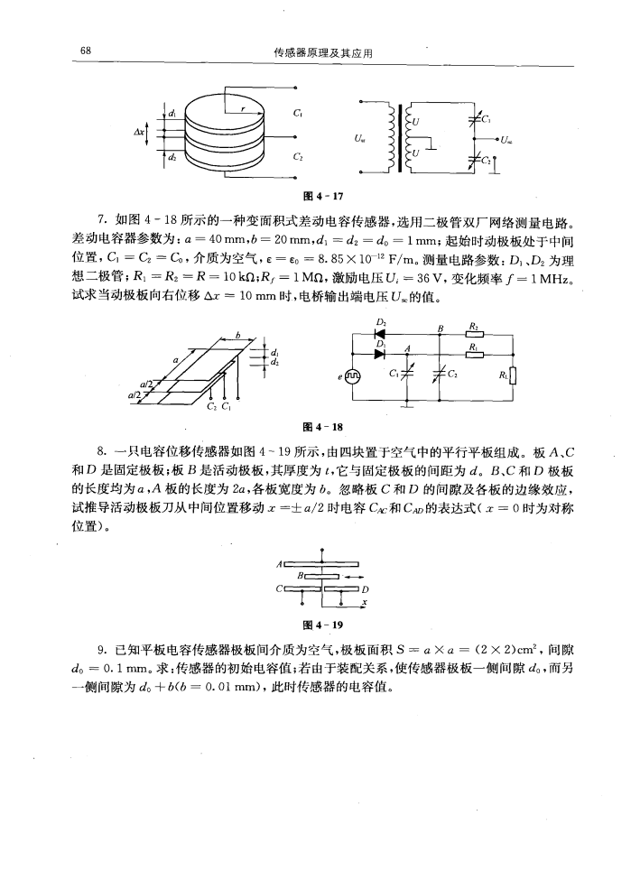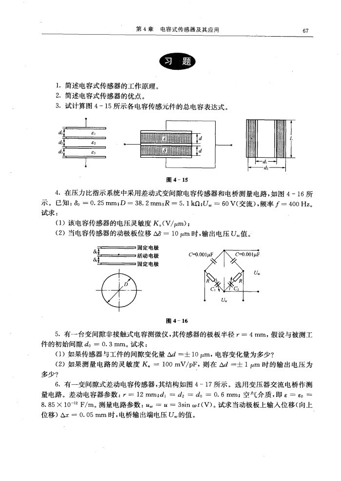 | 文摘: 图4-14是电容式差压传感器结构示意图。这种传感器结构简单、灵敏度 高、响应速度快(约100ms)、能测微小压差(0〜0.75 Pa)。它是由两个 玻璃圆盘和一个金厲(不锈钢)膜片组成。两玻璃圆盘上的凹面深约25 mm,其上镀金属以作为电容式 传感器的两个固定极板,而夹在两凹圆 盘中的膜片则为传感器的可动电极,则形成传感器的两个差动电容C1、 C2。当两边压力p1、p2相等时。膜片处在中间位置与左、右固定电容间距 相等,因此两个电容相等…… |