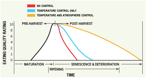 在这些因素应用合适的地方,控制和改变环境能够非常明显的延长某些水果和蔬菜货物的存储寿命。减缓它们的代谢速率可以延迟产品的自然成熟而不影响它的风味和口感。