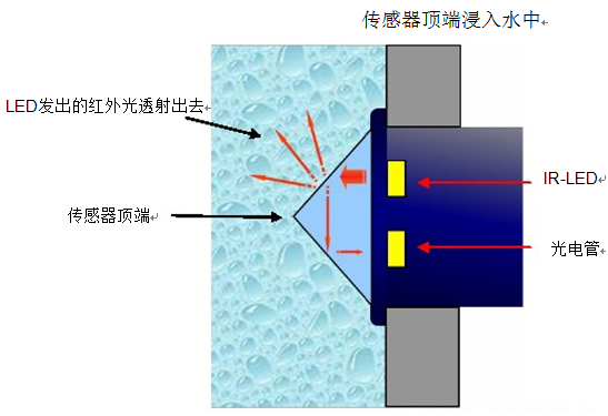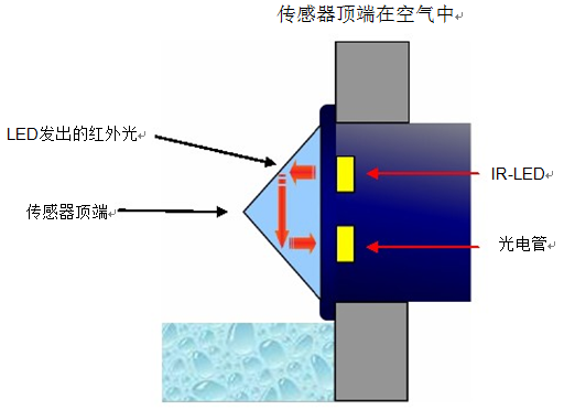 光电液位开关传感器内包含一个红外线发光二极管和一个光电接收器。发光二极管所发出的光被导入传感器顶部的棱镜。如果没有液体,则发光二极管发出的光直接从棱镜反射回接收器。 当液体浸棱镜时,则光折射到液体中,从而使接收器收不到或只能接收到少量光线。以此工作原理来通过感应这一变化。接收器可以驱动内部光电液位开关的电气开关工作,从而启动外部报警或控制电路。此种工作原理设计的SST sensing光电液位开关系列在应用于液面的位置监测工作过程中有着极高的准确度和重复性央监测液体界面中其重复性高达±1mm。