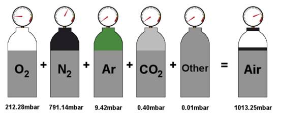 氧分压的概念:收集一瓶空气,将其中的氮气除去,剩余的氧气仍会逐渐占满整个集气瓶,此时的压强会比原来的低,该值为原空气中氧气的分压值。根据道尔顿定律:大气压等于氧分压、氮分压等所有气体分压的总和:Ptotal=ppO2+ ppN2+ ppAr+ ppCO2+ ppH2O+ ……