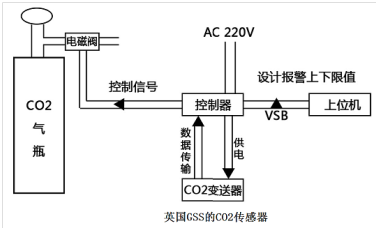 接下来让我们来看一个典型的CO2室内控制系统的方案。本方案适用于室内植物养殖、鱼池CO2供给等项目,可以利用GSS品牌的CO2传感器实时检测CO2浓度值,并通过CO2变送器把数据传送给系统中相关的控制模块辅助该控制模块对CO2浓度值进行有效的流量控制,同时使用上位机还可调节CO2的报警值。