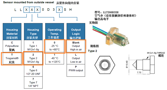 但是,由于需要与饮品直接接触,所以这对传感器的具体材料也规定了严格要求,zui主要的就是能和食品接触并且无毒无害。SST生产的液位开关则非常好地满足这个条件。上图中使用的型号就是由英国SST生产的液位开关LLT200D3SH。该型号相关信息如下。