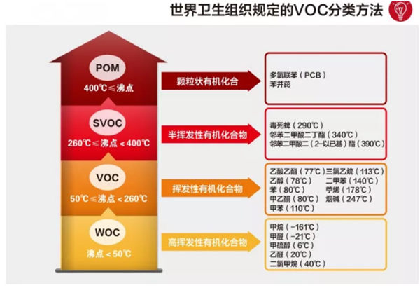 目前常见的是WHO(世界卫生组织)规定的分类方法,它根据沸点对VOC进行了分类。