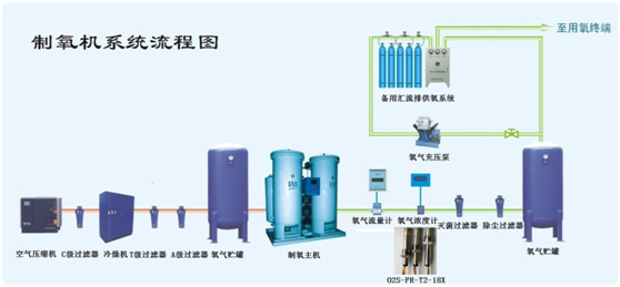 制氧制氮系统主要由空气预冷系统、分子筛纯化系统、空气精馏系统、制冷系统等系统组成。 其工艺流程如下:制氧制氮系统采用螺杆压缩机供气,分子筛吸附水分和二氧化碳,返流气体进入透平膨胀机膨胀制冷,低温液体泵内压缩,带辅助氮冷凝蒸发器的单级精馏塔精馏来实现气氧、气氮、液氧、液氮四个工况的工艺流程。其基本工作过程为:环境空气由螺杆压缩机升压后,经过油水分离器、初级油过滤器、空气预冷机组、管路储气筒、精油过滤器和超精油过滤器,除去空气中的油分、水分,再经分子筛纯化机组除去剩余的水分、二氧化碳等杂质,净化后的空气进入冷箱,经两组板式换热器换热,使加工空气的温度下降,达到饱和状态,后空气进入分馏塔进行精馏,分离出满足要求的液氧