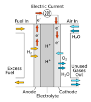 质子交换膜燃料电池(proton exchange membrane fuel cell)是一种有着较高的能量效率和能量密度的新型燃料电池,有着工作温度低、体积重量小、冷启动时间短、运行安全可靠、结构简单、操作方便等优点使用的质子交换膜为固定电解质膜,有效避免腐蚀。质子交换膜燃料电池在原理上相当于是水电解的逆装置,电池由阳极、阴极、质子交换膜组成,阳极为氢燃料发生氧化的场所,阴极为氧化剂还原的场所,中间还有催化剂。质子交换膜在电池中充当H+的介质,只允许H+通过,而电子则从导线通过,那么电子的流动就相当于一直流电源,阳极即电池正极,阴极即电池负极。简单的原理示意图: