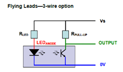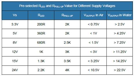如右上图,RLED是限流电阻,作用是限制电流以免烧坏光电液位开关内部的光电二极管,RPULL-UP是上拉电阻,保证产品探头在未接触到任何液体时,绿线上的输出恒为高电平,只有当光电开关导通,即检测到液体存在,或者说探头接触到了水时,输出电平才会有明显的改变,从高变低,反之亦然。