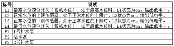 (1)正常水位时:L3、L4状态为On,输出低电平,L1和L2状态为Off,输出高电平,P1、P2和P3状态为关闭,给水泵和排水泵都不工作。