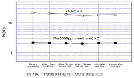 新国标在还有一项硅蒸汽测试,TGS2611-E00带有过滤层的,完全能够满足新国标的要求,新国标的测试标准是传感器要能在10ppm的HMDS气体中工作四十分钟,放回空气中误差要在允许范围内。而TGS2611-E00坚持一周以上都是没问题的。