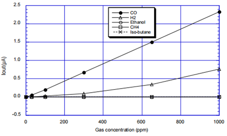 毕竟是事关我们的生命安全,对于精度还是有要求的,测量不准的话又怎么能给出正确的警报呢?TGS5141输出电流与一氧化碳浓度之间在0~1,000ppm范围内显示了± 5%以内偏差的较高直线性。不同浓度CO对应的输出电流可以参考下图。
