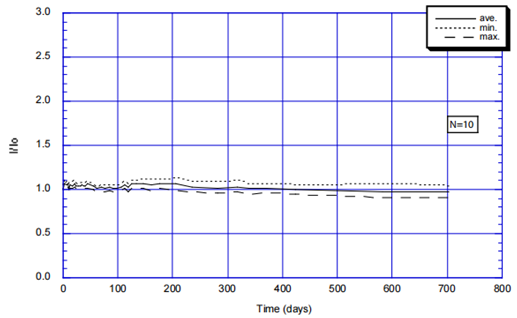 同时我们也要关注传感器的长期稳定性,毕竟要求车主们频繁更换是不太现实的。这就要求传感器寿命足够长,更要求传感器输出长期稳定,不然会使报警值改变,造成早报晚报甚至不报等情况了。TGS5141的寿命长达十年以上,长期稳定性也是十分优秀,可以参考下图。(Y轴显示的是在任何时间点300ppm一氧化碳中的输出电流(I)和测试第一天300ppm一氧化碳中的输出电流(Io)的比值。)