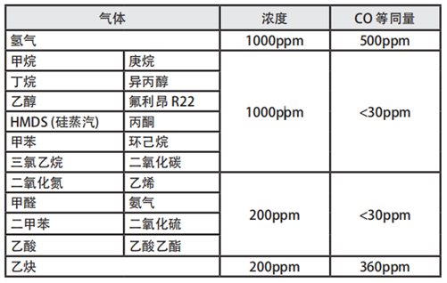 汽车或者储能电站内会有各种各样的气味,要是传感器抗干扰性不好的好,也是很容易造成误报的,所以这个传感器要求对CO灵敏度高,对其他气体的灵敏度越低越好。TGS5141就很好,对大部分气体的灵敏度都是非常低的,对CO灵敏度又很高的,见下图。