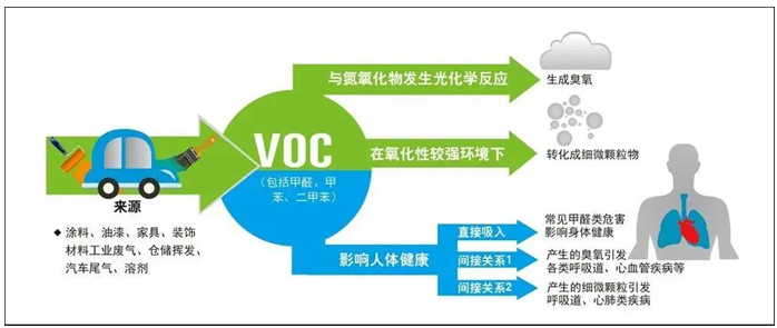 了解了VOC的定义,这VOC总不可能平白无故的产生吧,VOC室外主要来自燃料燃烧和交通运输;室内主要来自燃煤和天然气等燃烧产物、吸烟、采暖和烹调等得烟雾,建筑和装饰材料、家具、家用电器、清洁剂和人体本身的排放等,简单来说我们日常生活中VOC无处不在,为什么VOC可以这么渗透在我们日常生活中呢?VOC的主要成分有:烃类、卤代烃、氧烃和氮烃,它包括:苯系物、有机氯化物、氟利昂系列、有机酮、胺、醇、醚、酯、酸和石油烃化合物等。这些成分说明VOC更多可能存在于化工、石油等等工业厂区,VOC这么普遍的存在,是否意味着我们生命时刻遭受着威胁呢?