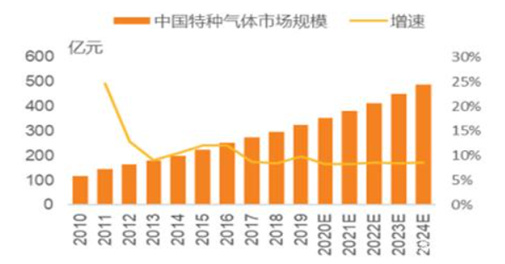 随着工业气体在更多领域的广泛运用,市场前景十分广阔。预计,18-22年我国工业气体市场CAGR为10.44%,到2022年有望达到近410亿美元规模。