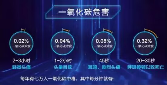 一氧化碳是无色,无臭,无味,但吸入对人体有十分大的伤害。它会结合血红蛋白生成碳氧血红蛋白导致人缺氧。最常见的一氧化碳中毒症状,如头痛,恶心,呕吐,头晕,疲劳和虚弱的感觉,暴露在一氧化碳中可能严重损害心脏和中枢神经系统,会有后遗症。根据测试,空气中的一氧化碳浓度达到50ppm时,健康成年人可以承受8小时;达到200ppm时,健康成年人2~3小时后,轻微头痛、乏力;达到400ppm时,健康成年人1~2小时内前额痛,3小时后威胁生命;到800ppm时,健康成年人45分钟内,眼花、恶心、痉挛,2小时内失去知觉,2~3小时内死亡。