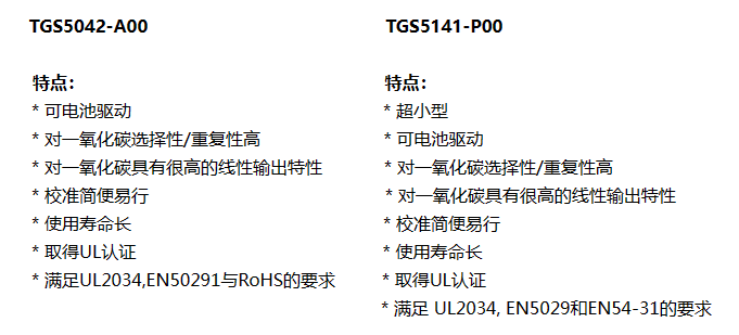 TGS5141是费加罗研发的可电池驱动的电化学式传感器,使用一个特殊的电极取代了储水器,由于去除了TGS5042中使用的储水器,TGS5141与TGS5042相比,其外形尺寸缩减到只有后者的10%大小。超小型的体积使其可以成为诸如便携式一氧化碳检测仪、微型住宅一氧化碳检测仪、多用途火灾检测仪的理想选择。