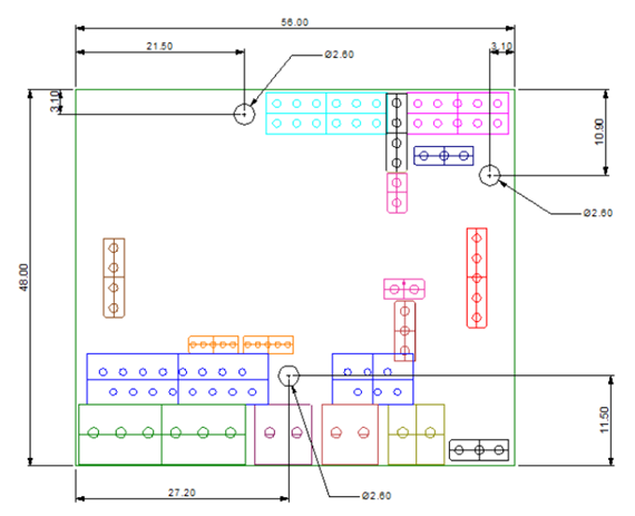 Novagas2变送板是所有NG2型号的通用板,宽56mm x 48mm。有三个孔(下图中为黑色)来按客户需求固定该板。