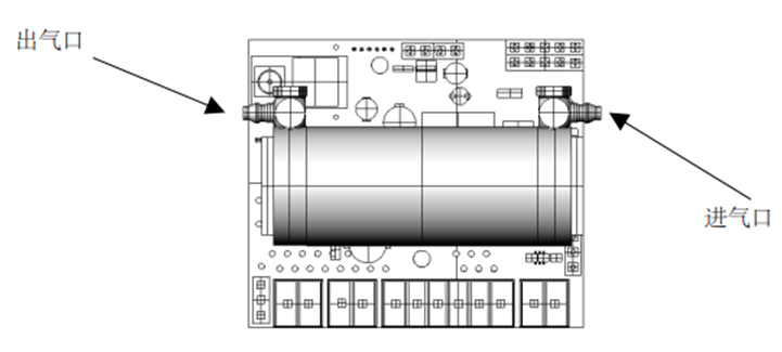 Novagas2传感器有两个管接头。如果气体在气体单元内偏向某个方向流动,传感器的测量性能则最佳。从顶部看Novagas2传感器,WEIDMULLER(橙色)连接器位于底部,右方的管口是进气口,左边的则是出气口。下图显示了进气口/出气口位置,参考气体单元和橙色连接器方向,这两个口的型号取决于Novagas2传感器的型号。