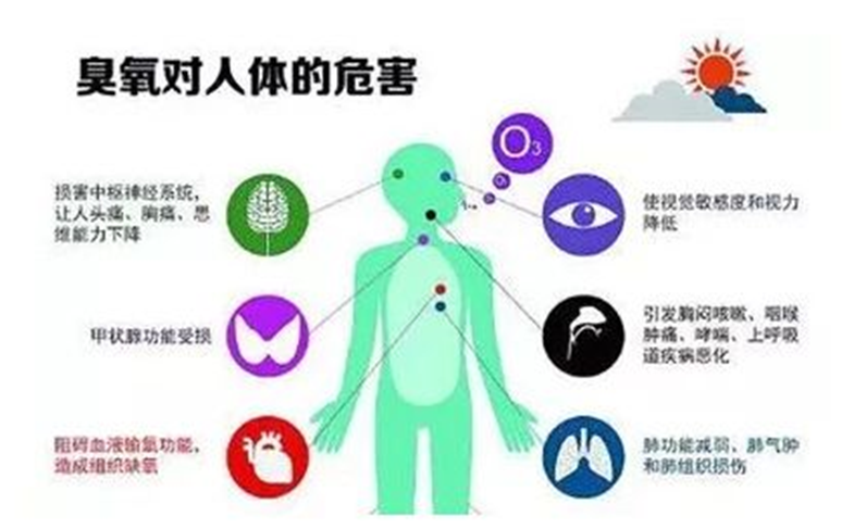 臭氧能到达呼吸道的深部,对呼吸器官有强烈的刺激作用,引起呼吸道的收缩。其刺激的程度胜于氮氧化物与二氧化硫,其对呼吸系统的毒性比氮氧化物大10倍以上。臭氧的嗅觉阈值很低,浓度达到0.02 ppm时,就能闻到臭味;达到0.1ppm时,呼吸2小时,将使肺活量减小20%,达到0.3ppm,对鼻、脑有刺激作用;超过1ppm时,眼、鼻、喉咙发干,有烧灼感,头痛,时间再长,中枢神经会发生障碍,思维还会紊乱;达到10ppm时,容易引起肺气肿。此外,臭氧还能阻碍血液输氧功能,造成组织缺氧;使甲状腺功能受损、骨骼钙化,还可引起潜在性的全身影响,如诱发淋巴细胞染色体畸变,损害某些酶的活性和产生溶血反应。大量实验研究表明,暴露在臭氧浓度为0.16 mg/m3的空气环境中,6.6小时,健康人群就会有不良影响的显著体现;达到0.30 mg/m3时,即可引起咳嗽。我国研究人员的实验也表明,臭氧浓度达到0.10~0.14 mg/m3时,人体的生理指标就会产生敏感性的变化。世界卫生组织认为,对运动着的敏感者而言,在臭氧浓度为0.20 mg/m3的空气环境中暴露1至8小时,其呼吸系统会受到显著性的伤害。患有哮喘病的儿童,属最敏感人群,臭氧浓度超过一定浓度时,他们的健康受到的影响最大,病情可能导致恶化。世界卫生组织选择8小时平均0.12 mg/m3作为2000年新修订的空气质量健康标准限值。我国制订的大气标准则为0.1 mg/m3。
