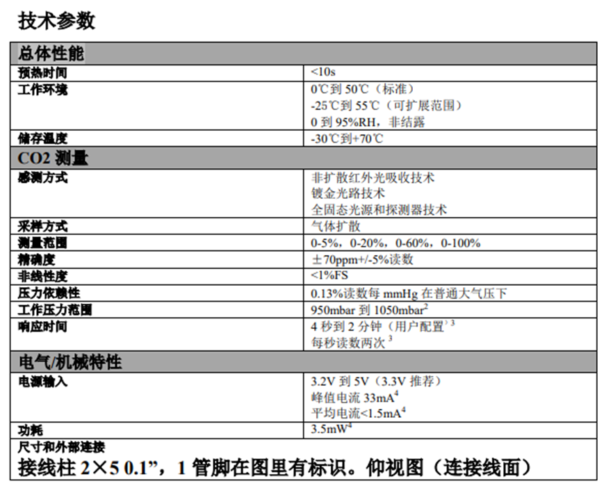 除了最基本的CO2浓度数字输出外,该传感器还可定制包含温湿度输出的数据,以及模拟电压输出0.5-4V。
