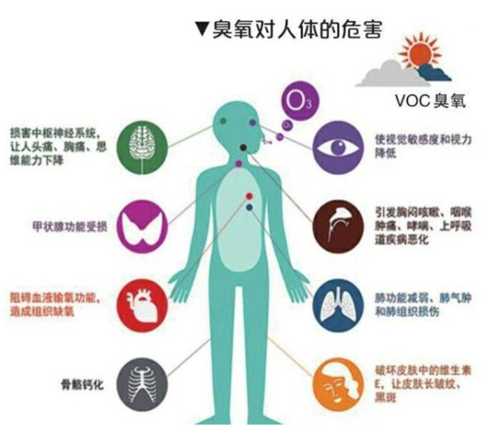 臭氧能到达呼吸道的深部,对呼吸器官有强烈的刺激作用,引起呼吸道的收缩。其刺激的程度胜于氮氧化物与二氧化硫,其对呼吸系统的毒性比氮氧化物大10倍以上。臭氧的嗅觉阈值很低,浓度达到0.02 ppm时,就能闻到臭味;达到0.1ppm时,呼吸2小时,将使肺活量减小20%,达到0.3ppm,对鼻、脑有刺激作用;超过1ppm时,眼、鼻、喉咙发干,有烧灼感,头痛,时间再长,中枢神经会发生障碍,思维还会紊乱;达到10ppm时,容易引起肺气肿。此外,臭氧还能阻碍血液输氧功能,造成组织缺氧;使甲状腺功能受损、骨骼钙化,还可引起潜在性的全身影响,如诱发淋巴细胞染色体畸变,损害某些酶的活性和产生溶血反应。大量实验研究表明,暴露在臭氧浓度为0.16 mg/m3的空气环境中,6.6小时,健康人群就会有不良影响的显著体现;达到0.30 mg/m3时,即可引起咳嗽。我国研究人员的实验也表明,臭氧浓度达到0.10~0.14 mg/m3时,人体的生理指标就会产生敏感性的变化。世界卫生组织认为,对运动着的敏感者而言,在臭氧浓度为0.20 mg/m3的空气环境中暴露1至8小时,其呼吸系统会受到显著性的伤害。患有哮喘病的儿童,属最敏感人群,臭氧浓度超过一定浓度时,他们的健康受到的影响最大,病情可能导致恶化。世界卫生组织选择8小时平均0.12 mg/m3作为2000年新修订的空气质量健康标准限值。我国制订的大气标准则为0.1 mg/m3。