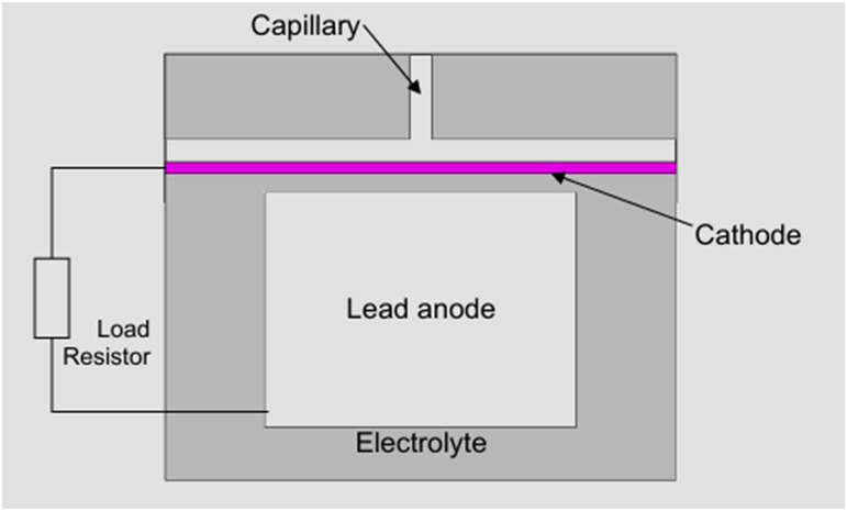 电化学氧气传感器通过电化学反应将氧气浓度转化为电信号进行量化。具体来说,当混合气体中的氧气分子穿过传感器一侧的半透膜进入电解液内部时,氧气在阴极被还原为氢氧根离子(OH⁻),同时产生电子。这些电子通过外部电路回流至阳极,形成闭合回路。还原与氧化反应产生的电流与进入电解液的氧气浓度直接相关,即氧气浓度越高,产生的电流越大。通过精确测量并转换此电流,即可确定混合气体中氧气的浓度。
