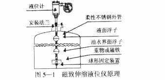 magnetostrictive method: The method used to measure the tank level of the principle shown in Figure 5-1 [6]. Figure 5-1, two floats were used to detect oil and gas interface and the oil-water interface. Have possession of the float within a set of permanent magnets, used to generate a fixed magnetic field. Measurement, given the low current level gauge head "ask" pulse magnetic field generated by the current downward conduction along the waveguide. Float when the current magnetic field and magnetic field meet, have a "return" pulse (also called "Bird distorted" pulse). Ask pulse and return pulse that corresponds to the time difference between the oil-water interface and the high oil and gas interface. Magnetostrictive level gauge easy to install, high accuracy, but the liquid density and temperature changes will bring the measurement error [7], float along the outside of the protection tube waveguide move up and down easily stuck.