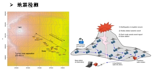 美国哈佛大学在去年部署了1套类似的应急地震监测系统,主要部署在火山地区用来监测因火山爆 发而导致的地震信息。系统采用TelosB无线传感器节点,搭载24位ADC用以监测MEMS加速度计传送的微弱振动信息。节点以火山口为中心径向部署, 间隔数百米部署1个节点。在部署完毕后可以监测出地震沿径向传播各点的振动信息。