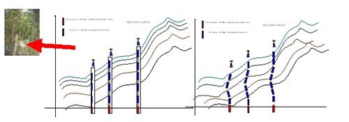 Crossbow和地理监测专门人员进行多次交流并进行数次实地考察后,Crossbow帮助地质专业公司Fugro和FT在HongKong大屿山和青山地区部署了基于无线传感器网络的山体滑坡监测方案。山体滑坡的监测主要依靠两种传感器的作用,倾角传感器和液位传感器。在山体容易发生危险的区域,将会沿着山势走向竖直设置多个孔洞,如图所示。