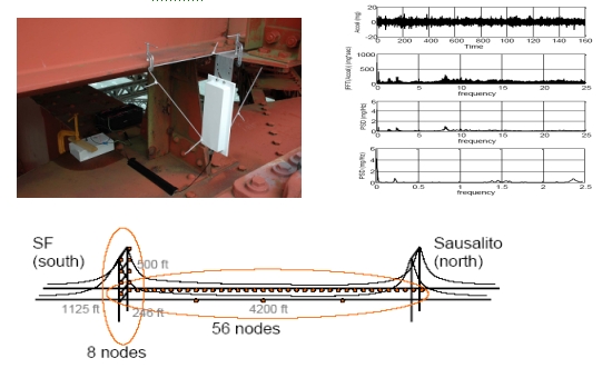 加速度计依然是监测建筑物的简单有效的方式。美国加州大学伯克利分校在Cross-bow的 协助下对旧金山金门大桥部署过建筑健康监测系统。其本意是用来检测桥体在风力作用下的各个关键受力点的振动状况,整体数据建模后就可以分析出桥体受损老化严重的部分,从而进行有针对性的修补。