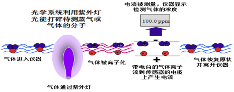 PID使用了一个紫外灯(UV)光源将有机物分子电离成可被检测器检测到的正负离子(离子化)。检测器捕捉到被离子化的气体的正负电荷并将其转化为电流信号实现气体浓度的测量。